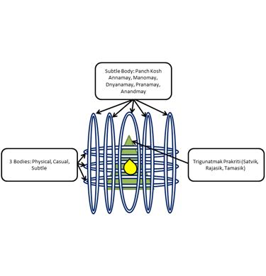Subtle body persist of PanchKosh those are Annamay Kosh, Manomay Kosh, Dnyanamay Kosh, Anandmay Kosh and Pranamay Kosh. Subtle Body persist of Karmic experiences of pain and pleasure. Pancha Kosha is a concept in yoga philosophy that refers to five layers of awareness through which all experience is filtered while performing Karma’s. These layers, or sheaths, exist in the human framework and cover the true self (atman).